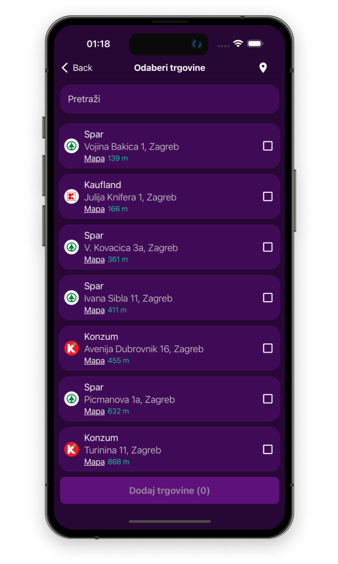 Aplikacija prikazuje sve trgovine u tvojoj blizini koristeći lokaciju mobitela kako bi lakše mogao odabrati trgovine koje najčešće posjećuješ.