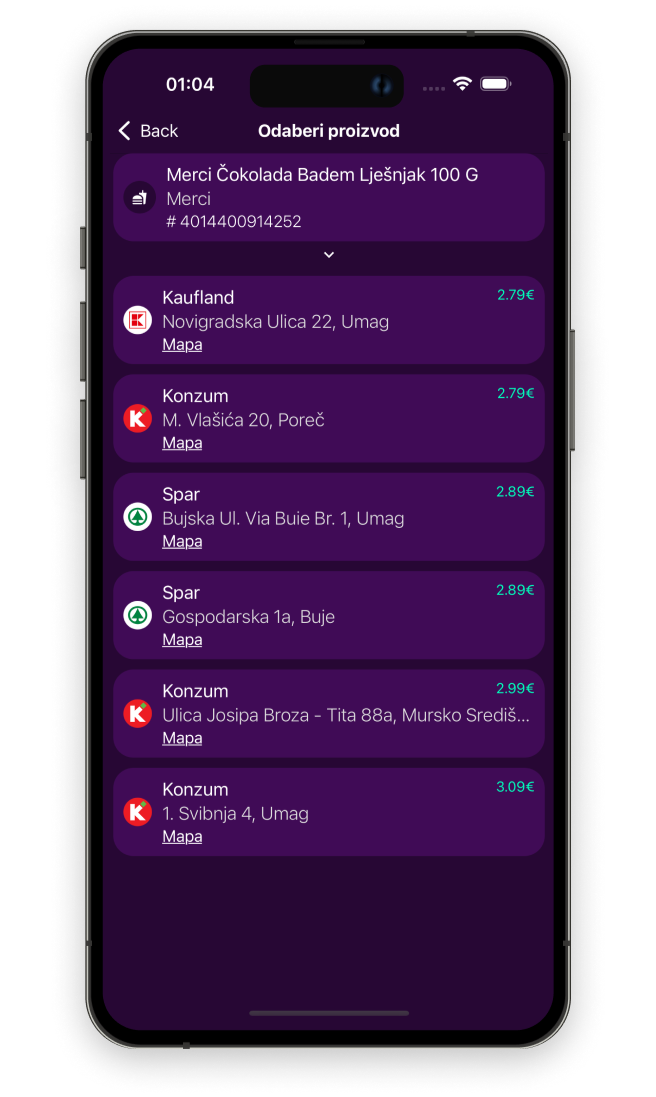 Aplikacija omogućava prikaz cijeni iz više trgovina za odabrani proizvod. Lako prepoznajte gdje je proizvod najpovoljniji za kupnju.