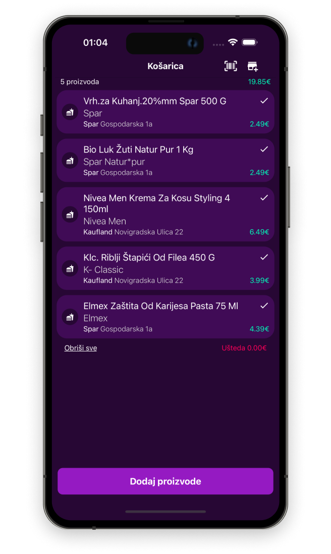 Dodaj proizvode na listu za kupnju. Tvoja lista je uz tebe tijekom kupovine i možeš jednostavno označiti što je već kupljeno.